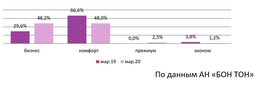 Комфорт-класс показал сокращение экспозиции на 21,2%, доля сократилась с 66,6 до 48%. Сегмент представлен 10 проектами и 31 корпусом. При этом за год рынок пополнился только 8 корпусами в уже реализуемых ЖК.