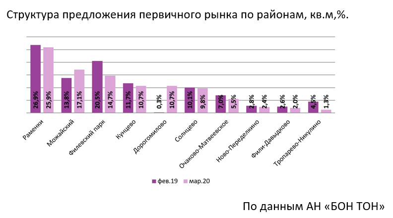 Как подсчитали в АН «БОН ТОН», по итогам марта первичный рынок ЗАО представлен 42 проектами, в составе которых находятся 106 корпусов. Объемы экспозиции составляют 385,5 тыс. кв.м или более 5,3 тыс. лотов. К аналогичному периоду прошлого года произошло сокращение предложения. Количество квадратных метров упало на 9,3%, а лотов на 14,2%, хотя рынок ЗАО пополнился 10 новыми проектами и корпусами в уже реализуемых новостройках.