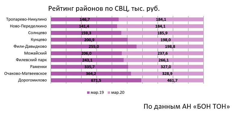 За год СВЦ существенно выросла в таких районах, как Ново-Переделкино (+30,2%), Тропарево-Никулино (+25,5%), Солнцево (+17%), Можайский (+15,3%), Филевский парк (+9,4%).