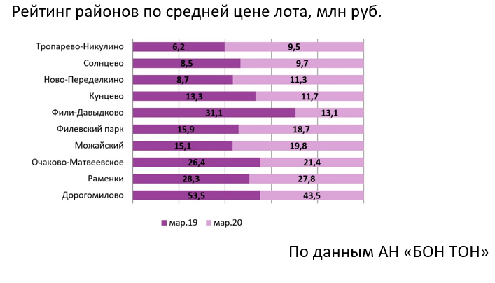 По средней стоимости лотов наблюдается аналогичная картина. ТОП-3 самых дорогих составили районы Дорогомилово (43,5 млн рублей), Раменки (27,8 млн рублей), Очаково-Матвеевское (21,4 млн рублей). Самые доступные локации – Тропарево-Никулино (9,5 млн рублей), Солнцево (9,7 млн рублей), Ново-Переделкино (11,3 млн рублей).