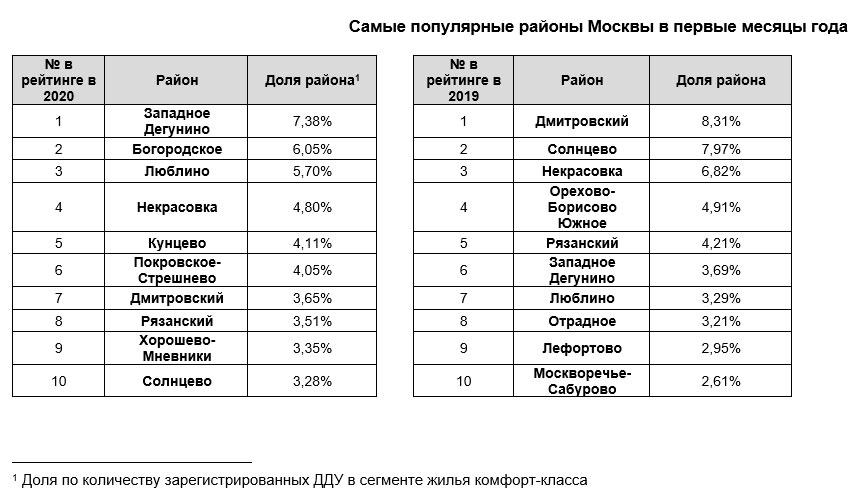 В январе и феврале 2020 года наибольшее число покупателей «комфортного» жилья выбирало новостройки в районе Западное Дегунино – на него приходится 372 сделки или 7,38% зарегистрированных ДДУ в сегменте комфорт. Высокие показатели отмечены также в районах Богородское и Люблино – 305 и 287 ДДУ (6,05% и 5,70% соответственно). Для сравнения – в прошлом году в тройку лидеров входили Дмитровский, Солнцево и Некрасовка.