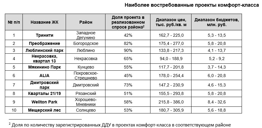 «Безусловно, покупатели жилья комфорт-класса в первую очередь обращают внимание на бюджет покупки. Помимо этого, важной составляющей является и местоположение проекта. Большинство из комплексов, представленных в рейтинге, отличаются хорошей транспортной и пешеходной доступностью – расположены буквально в нескольких минутах от станций метро или имею развитую сеть общественного транспорта, - комментирует Владимир Моребис, партнер, коммерческий директор компании Est-a-Tet. – Поэтому вполне логично, что районы, попавшие в тройку самых популярных у покупателей, отличаются развитой социальной и торгово-бытовой инфраструктурой».