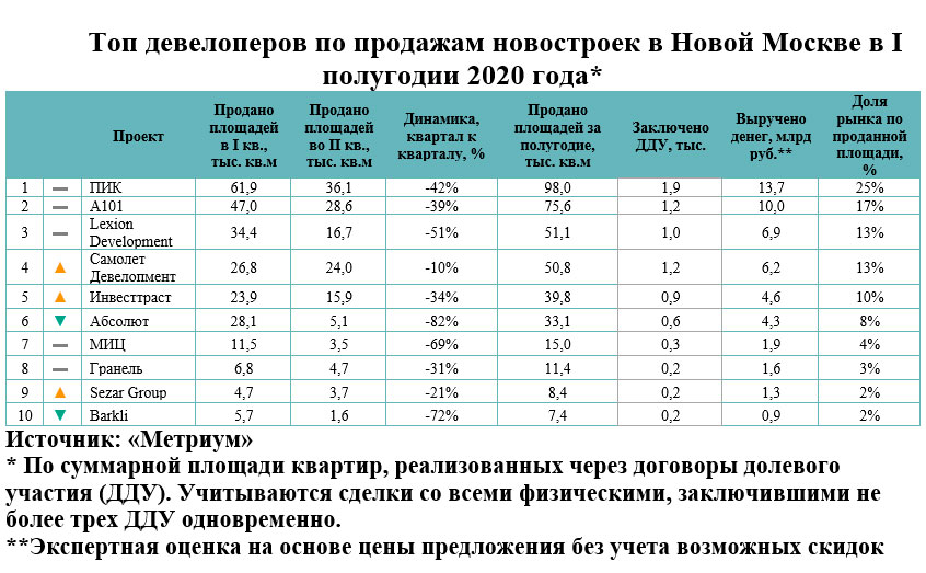 По данным аналитиков «Метриум», в I полугодии 2020 года 55% выручки девелоперов, работающих на рынке новостроек Новой Москвы, пришлось только на три компании, занимающие первую, вторую и третью позиции в рейтинге самых успешных застройщиков в локации. В общей сложности они заработали порядка 30,6 млрд рублей от реализации 225 тыс. кв.м.