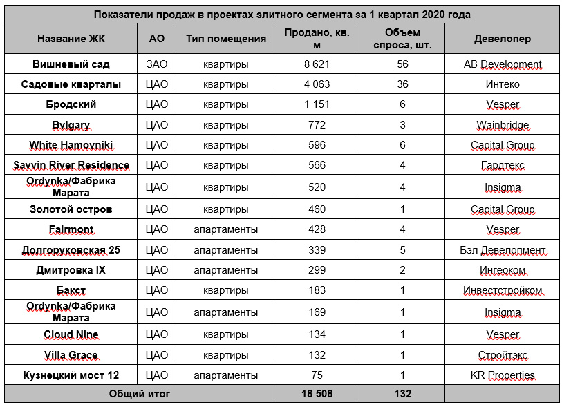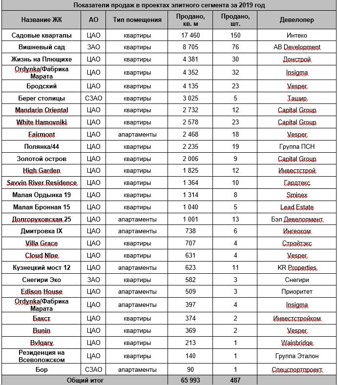 За 2019 год среди проектов элитного сегмента было зарегистрировано почти 500 ДДУ или 66 тыс. кв. м. Самым популярным стал комплекс «Садовые Кварталы» от ГК Интеко, в нем было реализовано более 17 тыс. кв. м жилья, это 150 договоров долевого участия. Клиенты также отдавали предпочтение также ЖК «Вишневый Сад» - в нем продано 8,7 тыс. кв. м (76 ДДУ) и ЖК «Жизнь на Плющихе», в котором показатели составляют 4,3 тыс. кв. м (30 ДДУ). В пятерку лидеров также вошли проекты Ordynka и ЖК «Бродский», которые аналогично лидерам показали отличные темпы реализации, а также отличаются высоким качеством строительства и уровнем жизни.