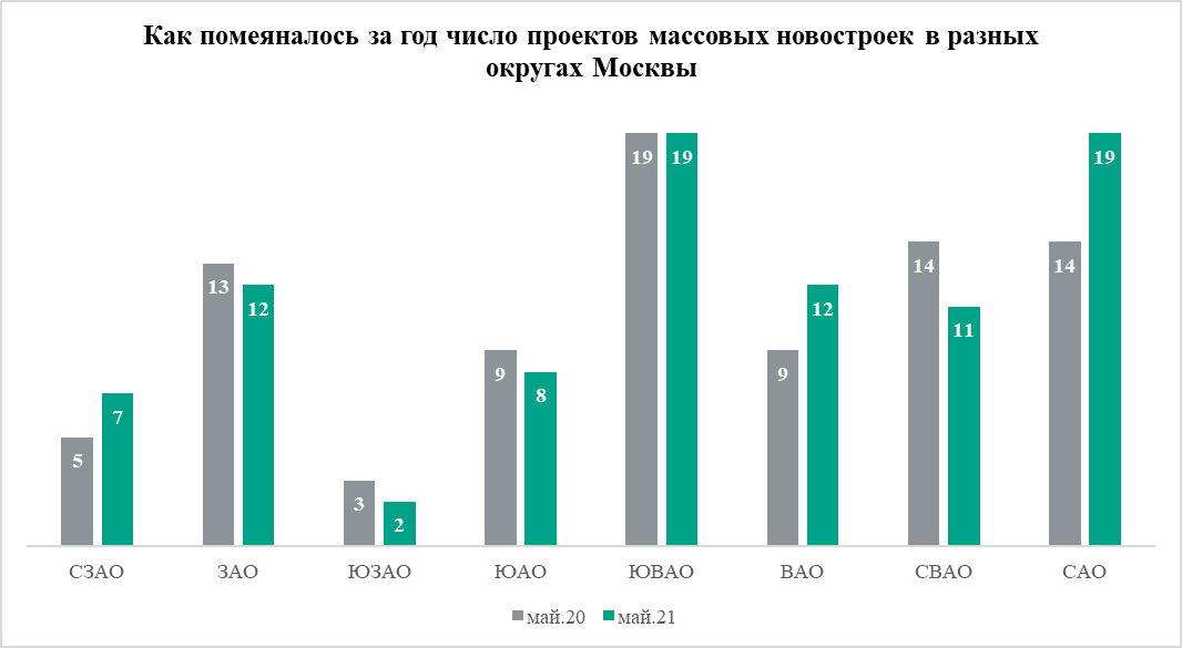 В мае 2021 года в Северном административном округе (САО) Москвы застройщики реализовывали 19 проектов массовых новостроек, тогда как год назад их было 14. По текущему числу ЖК САО потеснил постоянного лидера московского девелопмента экономичных комплексов – Юго-Восточный административный округ (ЮВАО), где реализуют 19 проектов, хотя этот показатель не изменился.