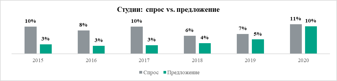 По итогам 2020 года спрос превышал предложение в двух секторах рынка новостроек Москвы. На студии пришлись 11% сделок от общего числа продаж квартир в новостройках, тогда как в структуре предложения они составляют 10%, подсчитали аналитики «Метриум». При этом только в 2020 году разрыв между этими показателями сократился. Последние пять лет спрос на студии стабильно превышал предложение: в 2015 году – на 7 процентных пунктов, в 2016 году – на 5 п.п., в 2017 – на 7 п.п., в 2018 – на 2 п.п., в 2019 – на 2 п.п.