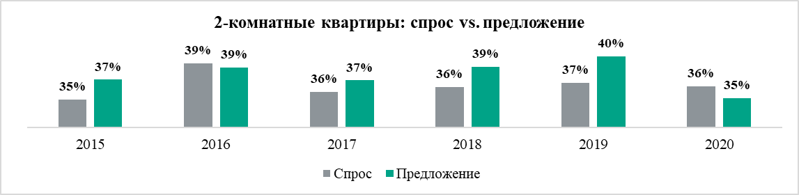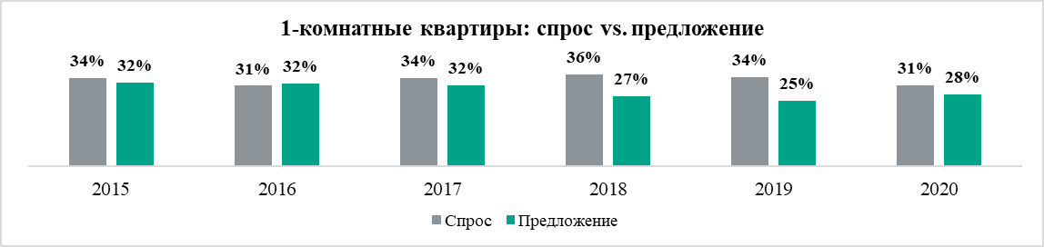 Второй формат жилья, спрос на который превышает предложение, – однокомнатные квартиры. В 2020 году доля сделок с этим типом квартир на московском рынке новостроек составила 31%, тогда как их удельный вес в предложении составил 28%. На протяжении последних спрос превышал предложения на однокомнатные квартиры. С 2015 года – на 2 процентных пункта, в 2016 году – доля сделок была меньше доли предложения на 1 п.п., а в 2017 году спрос вновь превысил предложения – на 2 п.п., в 2018 и 2019 – на 9 п.п.