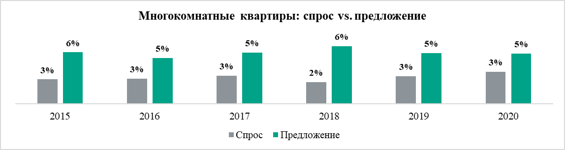 Стабильно выше предложение трехкомнатных квартир. В 2020 году на их долю пришлось 18% сделок против 22% от общего числа квартир в продаже. Доля предложения трехкомнатных квартир стабильно превышает спрос на 3-5 процентных пунктов. Схожая ситуация и на рынке многокомнатных квартир, на долю которых пришлось 3% сделок, хотя они образуют 5% квартир в продаже.
