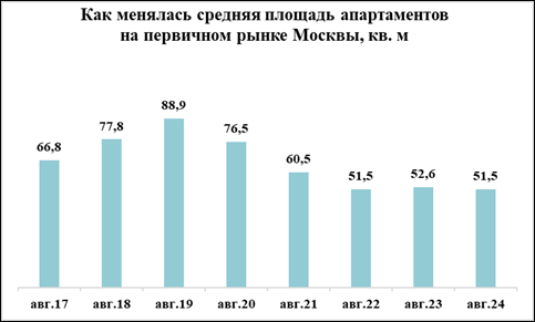 Аналитики «Метриум» подсчитали, что средняя площадь апартаментов на первичном рынке столицы сейчас составляет 51,5 кв. м. За прошедшие 12 месяцев она сократилась на 2,1%. Год назад показатель был равен 52,6 кв. м.