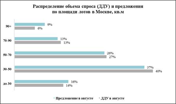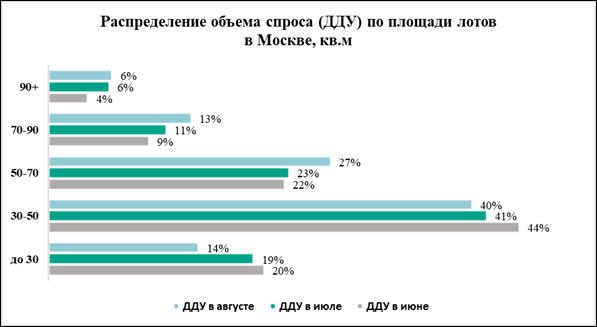 В свою очередь, средняя площадь проданных квартир в столице по договорам долевого участия (ДДУ) в январе-августе 2024 года составляет 49,7 кв. м, апартаментов – 40,9 кв. м. Это свидетельствует о том, что максимальным спросом в большинстве сегментов с начала 2024 пользовались компактные форматы. Тем не менее, в июле-августе ситуация изменилась, спрос на малогабаритные квартиры существенно упал, так как ведущие девелоперы не распространили на них дисконт. Кроме того, небольшие варианты почти неактуальны в рамках семейной ипотеки, которая сейчас осталась единственной действующей госпрограммой в Москве.