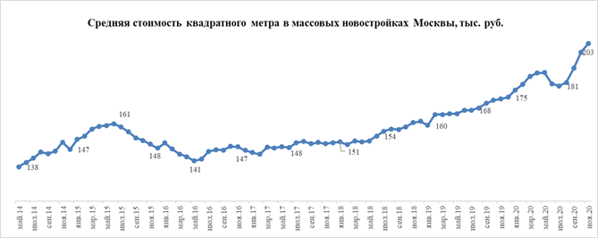 В ноябре средняя стоимость квадратного метра в проектах новостроек массового сегмента в Москве достигла 203 тыс. рублей за квадратный метр. По сравнению октябрем она увеличилась на 2,3%, с началом года – на 16%, с ноябрем 2019 года – на 17%.