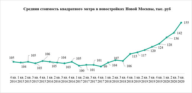Примечательно, что на рынке новостроек Новой Москвы в III квартале также зафиксирован рекордный рост цены с 2015 года. Никогда прежде за 12 месяцев средняя стоимость квадратного метра в местных новостройках не увеличивалась на 25% до 155 тыс. рублей.