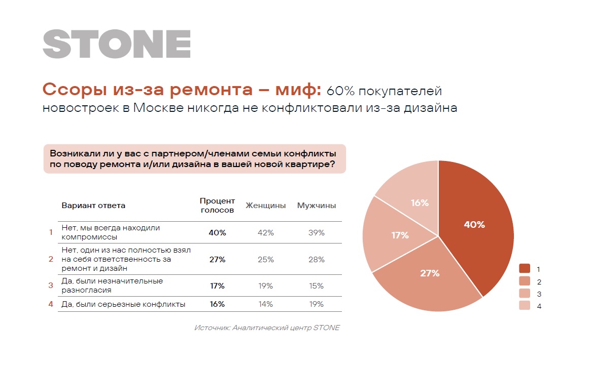 Опрос аналитического центра STONE проходил в октябре-декабре 2024 года. В нем приняли участие 1500 московских семей, которые приобрели квартиру без ремонта в новостройке. Респондентам задавался вопрос: «Возникали ли у вас с партнером/членами семьи конфликты по поводу ремонта и/или дизайна в вашей новой квартире?». Цель исследования – понять, насколько реально распространены разногласия в процессе ремонта и как представители разных полов справляются с решением данных задач.