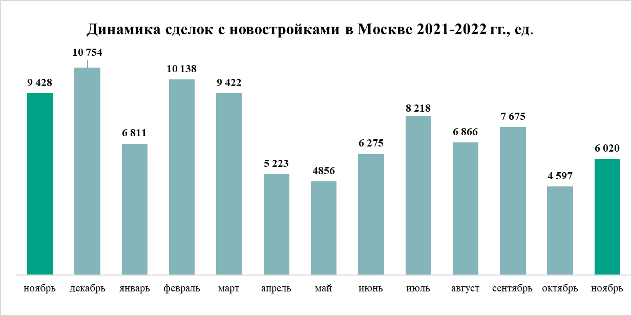 В ноябре покупатели квартир в строящихся домах, по данным Росреестра Москвы, заключили в Москве 6 тыс. договоров долевого участия, что на 31% больше, чем в октябре, когда было зарегистрировано 4,6 тыс. ДДУ. Таким образом, московским девелоперам удалось несколько отыграть октябрьское падение спроса, которое стало следствием мобилизации и других факторов. Однако спрос все ещё остается ниже среднемесячного значения в 2022 году (около 7 тыс. ДДУ).
