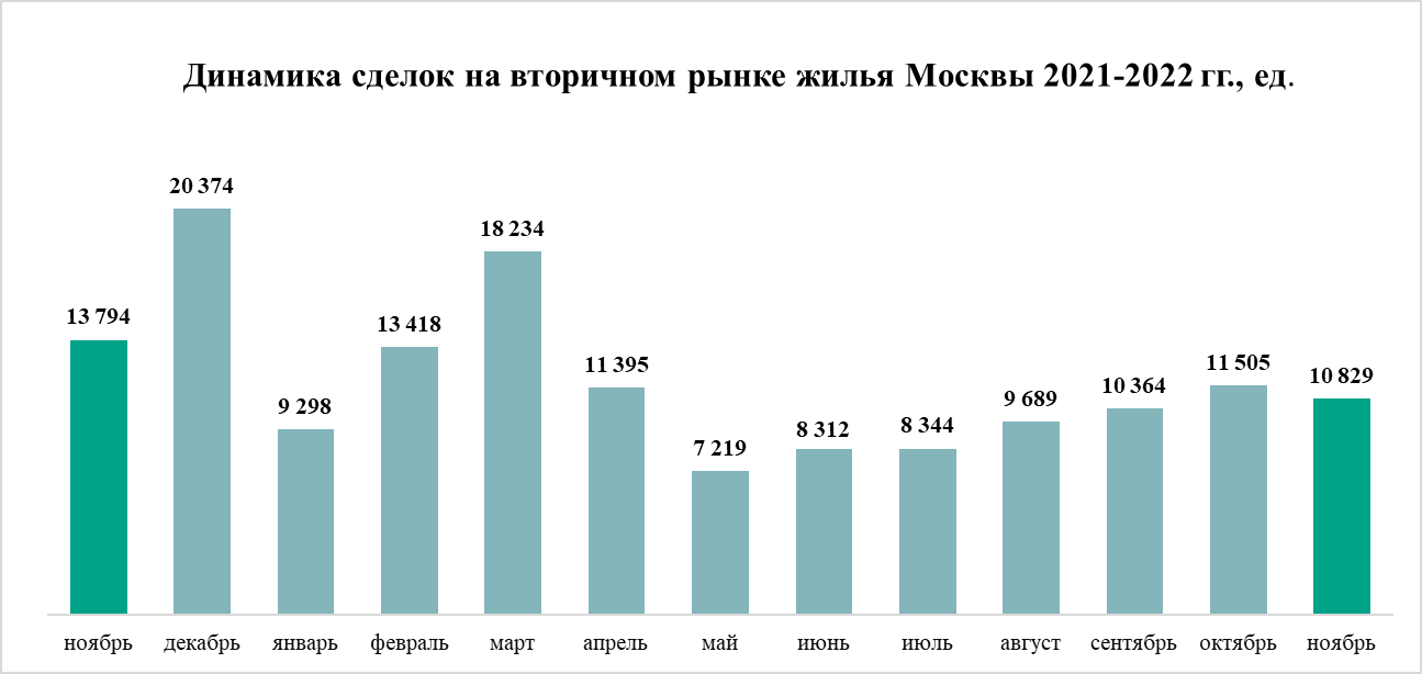 На вторичном рынке жилья в Москве спрос снизился. В ноябре Росреестр Москвы зарегистрировал 10,8 тыс. договоров купли-продажи вторичных квартир, а также жилья в готовых новостройках, что на 6% меньше, чем октябре (11,5 тыс.). По сравнению с ноябрем 2021 года активность покупателей была на 21% ниже (а в октябре в сравнении с тем же месяцем 2021 года – на 23%). С начала года количество заключенных в Москве сделок с готовым жильем оказалось на 21% ниже, чем в январе-ноябре 2021 года.