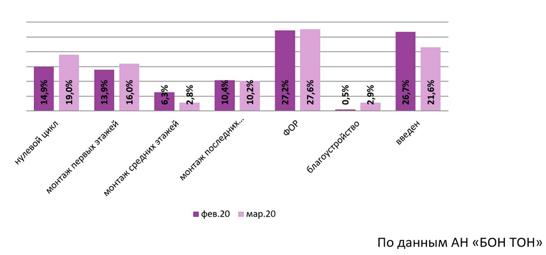 По итогам марта увеличилась доля предложения бизнес-класса на нулевом цикле (с 14,9% до 19%). Экспозиции на данном этапе строительства стало больше на 20%. Новостройки на стадии монтажа первых этажей также показали положительную динамику. Доля выросла с 13,9% до 16%, а объемы увеличились на 8,2%.
