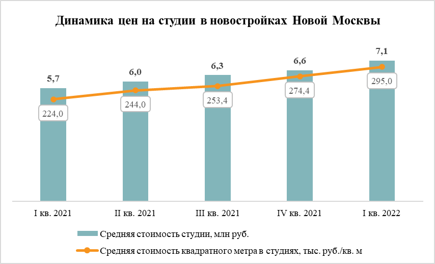 В I квартале 2022 года девелоперы новостроек в Новой Москве в среднем продавали студии за 7,1 млн рублей, тогда как в IV квартале 2021 года – за 6,6 млн рублей. Таким образом, за первые три месяца 2022 года студии в среднем подорожали на 500 тыс. рублей или на 8%, подсчитали аналитики «Метриум».