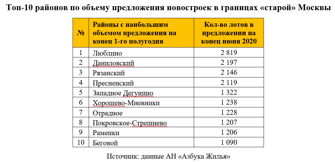 Департамент консалтинга и аналитики агентства недвижимости «Азбука Жилья» проанализировал объем предложения и продаж в сегменте новостроек в разрезе по районам «старой» Москвы и динамику за прошедшее полугодие. Рынок новостроек распределен по «старой» Москве не равномерно. Из общего количества в 125 районов на 15 районов приходится 21,7 тыс. лотов, что составляет более половины от всего объема предложения первичного жилого рынка столицы, а в 36 районах и новостроек в реализации нет.