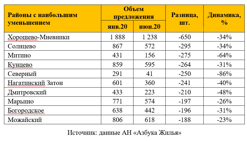 По сравнению с началом 2020 года наибольшее снижение объема предложения отмечено в районах Хорошево-Мневники (уменьшение на 650 лотов), Солнцево (меньше на 295 лотов) и Митино (меньше на 275 лотов).