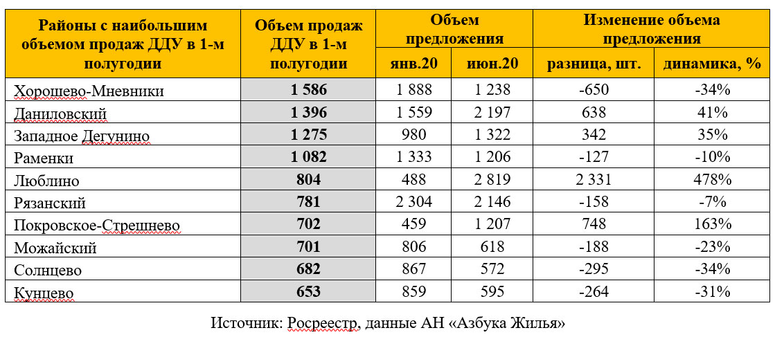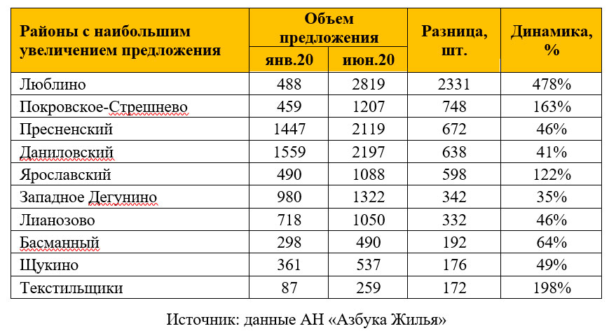 Наибольший рост объема предложения (квартир и апартаментов в продаже) за полгода отмечен в районе Люблино, в котором предложение возросло более чем на 2 тыс. лотов, в основном за счет ЖК «Люблинский парк» от ГК ПИК. Другими районы с большим увеличением предложения являются Покровское-Стрешнево (за счет комплексов «Сити Бэй», «Левел Стрешнево» и «Движение Тушино») и Пресненский (параллельно развиваются несколько крупных проектов бизнес-класса).
