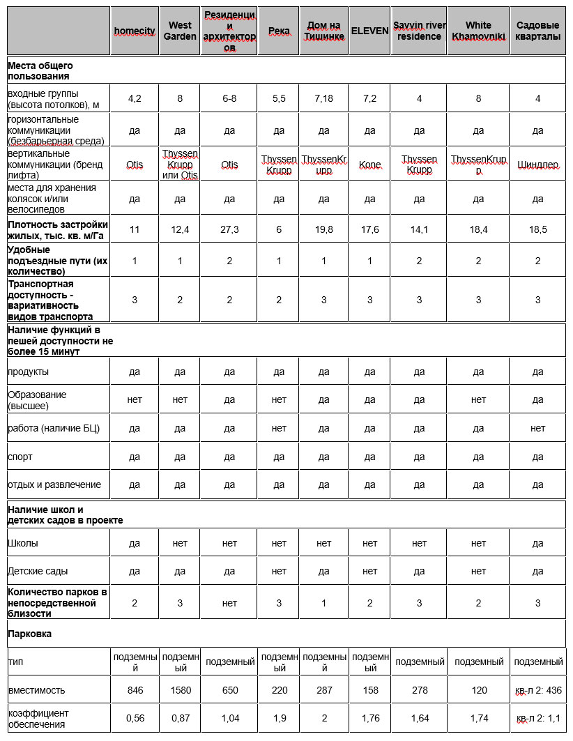 Аналитиками компании Est-a-Tet рассмотрены новостройки на стадии строительства, этажностью до 16 этажей, с плотностью застройки не более 30 тыс. кв. м/га, стартовавшие не ранее 2018 года. Так как именно эту категорию новостроек можно оценить по параметрам современной урбанистики. Также в исследовании участвовали проекты с количеством корпусов более одного. Не рассматривались жилые комплексы с объёмом предложения менее 5 лотов. Из текущей выборки были определены по три жилых комплекса максимально соответствующих по совокупности комфортного проживания и площади участка для каждого класса и рассмотрены по основным характеристикам для жилых проектов. На основании этих параметров был проанализирован рынок Москвы по сегментам бизнес, премиум и элит.
