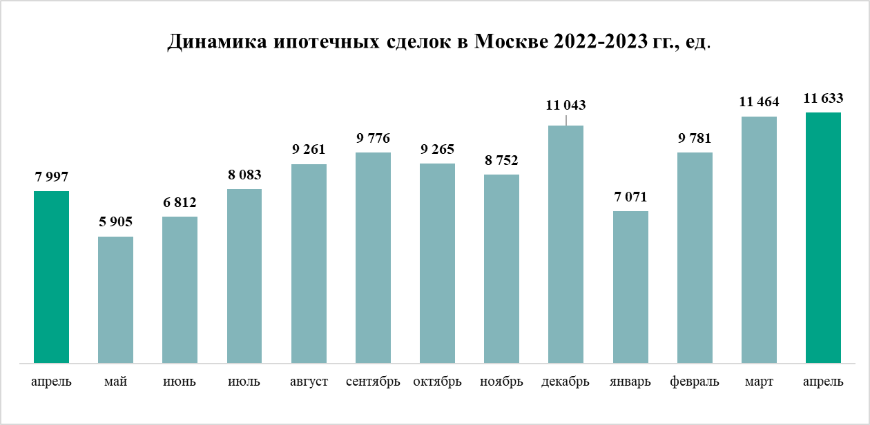 Схожую динамику продемонстрировал спрос на ипотеку. В апреле 2023 года Росреестр Москвы зафиксировал 11,6 тыс. соглашений между заемщиками и банками, что на 1% больше, чем в марте. Между тем в апреле 2022 года было зарегистрировано 8 тысяч ипотечных сделок, то есть в годовом измерении спрос заемщиков повысился на 45%. Последний максимум рынок ипотеки продемонстрировал в прошлом месяце (11,5 тыс. сделок).