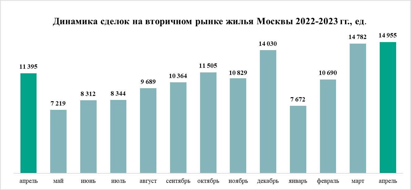 На рынке готового жилья в Москве активность покупателей в апреле 2023 года также повысилась. Было зарегистрировано почти 15 тысяч договоров купли-продажи, что на 1% больше, чем в марте (14,8 тыс.). Предыдущий максимум был в марте (11,5 тыс. сделок). В годовом измерении активность клиентов во вторичном сегменте увеличилась на 31%. В апреле 2022 года Росреестр зарегистрировал 11,4 тыс. сделок купли-продажи.