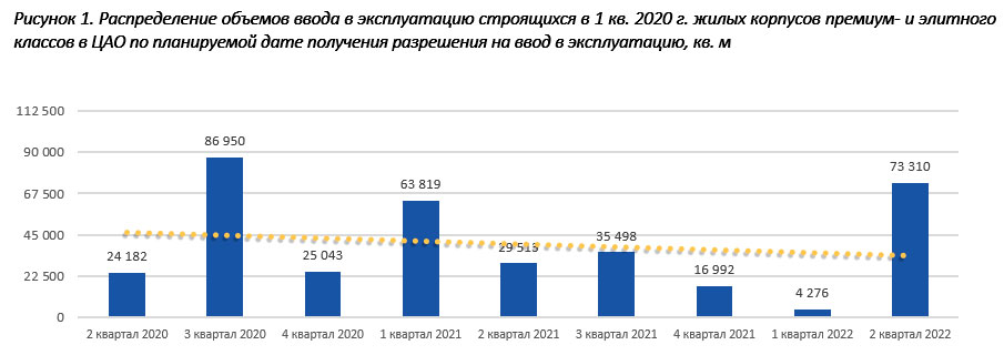 Согласно данным платформы, ЦАО занимает 5-е место по объему реализуемого жилья в Москве (данные по состоянию на 1 квартал 2020 года) — в продаже представлено свыше 1,77 млн кв. метров квартир и апартаментов. Львиная доля (свыше 80%) реализуемых проектов ЦАО относится к премиум- и элит-классам. До конца 2020 года на рынке высокобюджетного жилья планируют ввести в эксплуатацию свыше 136 тыс. кв. метров, причем пик ввода ожидается в 3 квартале: застройщики могут сдать в эксплуатацию более 86,9 тыс. кв. м новостроек.