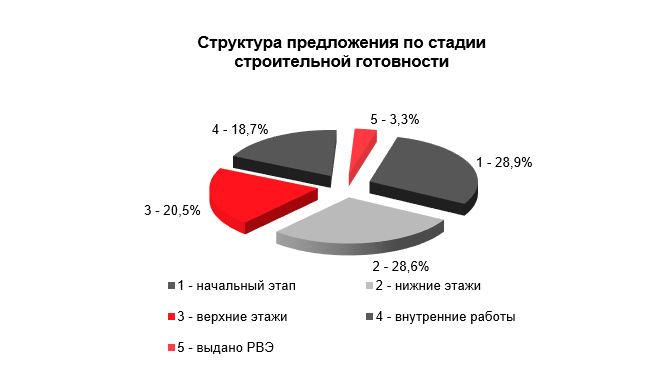 За квартал существенно сократилась доля проектов на начальном этапе строительства – с 54,6% до 28,9%. При этом вырос объем предложения в корпусах, находящихся на стадии монолитных работ нижних и верхних этажей, – с 30,4% до 49,1%.