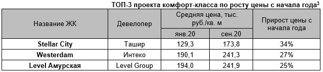 Среди проектов комфорт-класса, присутствовавших на рынке с начала года, максимальный прирост цены отмечен в ЖК Stellar City (34%), Westerdam (27%) и Level-Амурская (25%).