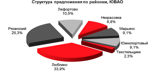 Наибольший объем предложения сосредоточен в районе Люблино – на него приходится 34%, при этом значительное влияние на данный показатель оказывает проект «Люблинский Парк». Существенные доли также зафиксированы в районах Рязанский – 25% и Лефортово -10,5% от общего объема предложения в округе.