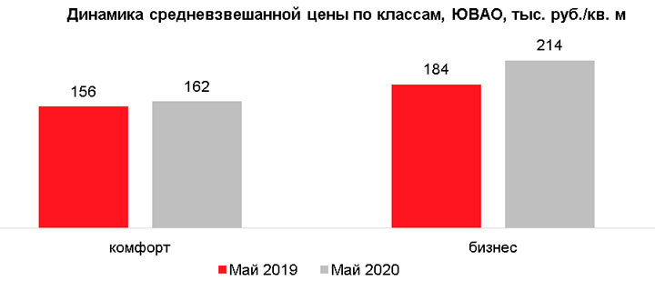 По данным специалистов департамента проектного консалтинга Est-a-Tet, объем предложения в ЮВАО составляет 391 тыс. кв. м в 24 проектах или 101 корпусе, при этом средняя цена в данной локации находится на уровне 174 тыс. руб./кв. м, за год она выросла на 9%. В этом округе наибольшую долю предложения занимают новостройки комфорт-класса – 77%, на сегмент бизнес приходится 23%.