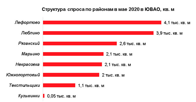 Юго-Восточный округ занимает 15% от общего объема реализованного жилья в столице, при этом наибольшим спросом пользуется жилье в Лефортово, в котором было реализовано 4,1 тыс. кв. м (13%), а также в районах Люблино и Рязанский, доли которых составляют 22% и 14% соответственно, в них в мае продано 3,9 и 2,6 тыс. кв. м соответственно.