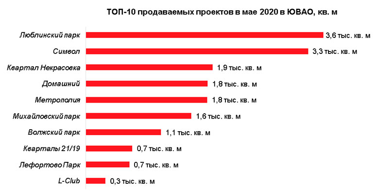 По итогам мая самым востребованным комплексом стал «Люблинский Парк», в котором было реализовано 3,6 тыс. кв. м. Популярностью пользовался также ЖК «Символ», в котором продано 3,3 тыс. кв. м, и проект «Квартал Некрасовка» c показателем 1,9 тыс. кв. м. В пятерку также вошли микрорайон «Домашний» от Группы ПСН и проект «Метрополия» с показателем 1,8 тыс. кв. м.
