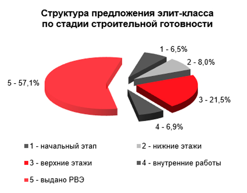 В элитном сегменте более половины объема предложения занимают квартиры в домах, введенных в эксплуатацию, – 57,1% (в прошлом квартале этот показатель находился на уровне 53,2%). Доля предложения новостроек, находящихся на стадии возведения верхних этажей, составляет 21,5%.