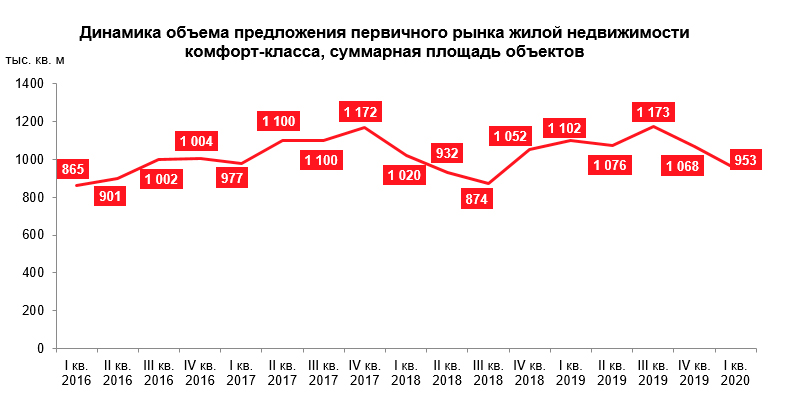Новостройки комфорт-класса занимают 39,8% предложения столицы, это 953 тыс. кв. м – по итогам I квартала 2020 года, в данном сегменте реализуется 19,4 тыс. квартир в 110 проектах (388 корпусов). Аналитики департамента проектного консалтинга Est-a-Tet отмечают, что в связи со снижением темпов выхода новых проектов и корпусов, произошло сокращение объема предложения – за год показатель снизился на 13,5%, за квартал на 10,8%.