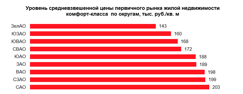 Средняя цена на квартиры комфорт-класса составила 183,1 тыс. руб./кв. м, за год показатель вырос на 7,7%, за квартал – на 5,1%. Значительное повышение отмечено в ЗАО (+12,4%) за счет существенного роста цен в крупных проектах округа, сейчас показатель находится на уровне 189 тыс. руб./кв. м. Наименьший прирост цены отмечен в СВАО – 0,8% до 172 тыс. руб./кв. м.