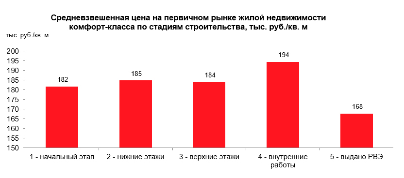 Самая высокая цена зафиксирована в новостройках, находящихся на этапе внутренних работ – 194 тыс. руб./кв. м. Значительно ниже показатель в уже готовых корпусах – 168 тыс. руб./кв. м.