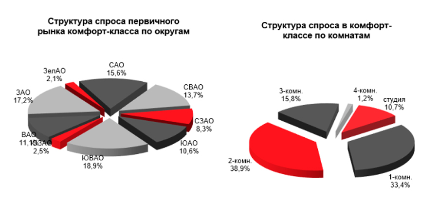 Большую долю предложения занимают двухкомнатные квартиры – 40,6%, на однокомнатные приходится 29%, трехкомнатные составляют 23,3%. При этом значительное количество нового предложение представлено в ЮВАО – 21,8%, доля СВАО увеличилась с 13,6% до 17,7%, а показатель ЮАО – 15,8%.