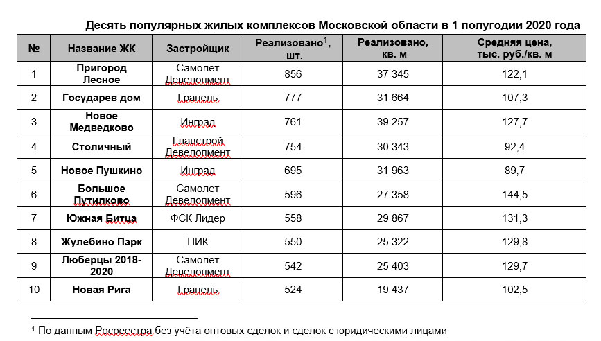 Самым популярным комплексом стал ЖК «Пригород Лесное», в котором было реализовано 37,3 тыс. кв. м или 856 лотов, средняя цена здесь находится на уровне 122,1 тыс. руб./кв. м. Не уступает по показателям и проект «Государев дом» - здесь продано 31,6 тыс. кв. м (777 штук), при этом средняя стоимость составляет 107,3 тыс. руб./кв. м. В тройку лидеров также вошел ЖК «Новое Медведково» - 39,2 тыс. кв. м, средняя цена кв. м – 127,7 тыс. рублей. Стоит отметить, что суммарная площадь реализованных лотов в проектах, представленных в рейтинге, занимает четверть от общего объёма спроса по Московской области.
