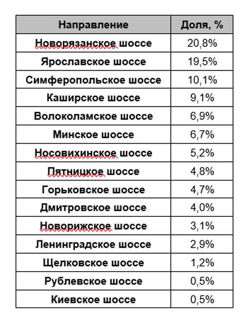 В тройку самых популярных направлений Московской области входят Новорязанское шоссе, Ярославское шоссе и Симферопольское шоссе, на них приходится 20,8%, 19,5% и 10,1% спроса соответственно.