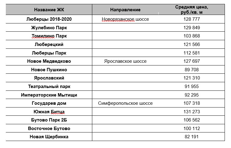 У покупателей, выбирающих проекты по Новорязанскому направлению, самыми востребованными стали комплексы «Люберцы 2018-2020», «Жулебино Парк», «Томилино Парк», «Люберецкий» «Люберцы Парк», при этом самая низкая цена отмечена в «Люберцы парк» - 112,5 тыс. руб./кв. м.