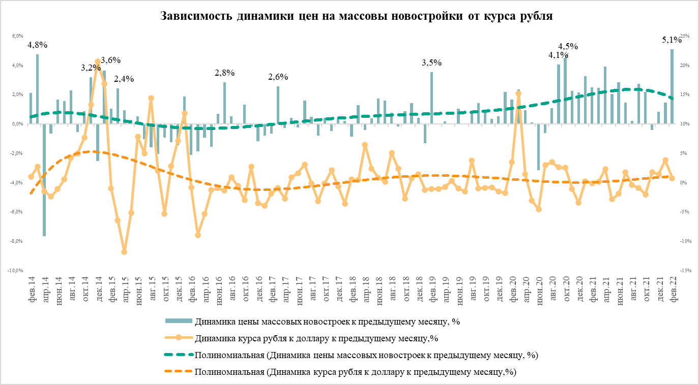 В последующие годы резкий рост цен на новостройки часто совпадал по времени с девальвацией рубля. Так, повышение курса доллара с 56 рублей до 65 рублей в декабре 2014 года и январе 2015 года привело к росту средней стоимости квадратного метра на 3,6% в тот же период. В январе 2016 года 12-процентная девальвация рубля (рост курса доллара с 70 рублей до 77 рублей) спровоцировала повышение цен на массовые новостройки за месяц на 2%, хотя в предыдущие полгода они только снижались. Рост курса доллара в марте 2020 года на 15% (с 64 рублей до 74 рублей) отразился в повышении стоимости квадратного метра на 2,3%. Плавная девальвация рубля в июле-октябре 2020 года привела к росту цен на массовые новостройки на 4,1% в сентябре и еще на 4,5% в октябре того же года.