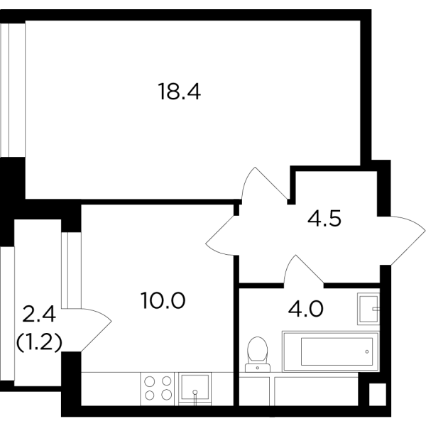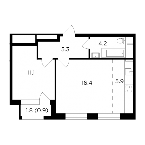 Однокомнатная квартира общей площадью 34,9 кв. м порадует владельца относительно большой кухней и достаточно просторной гостиной-спальней. В комнате есть ниша, где можно установить шкафы. Найдется место и для шкафчика в прихожей.