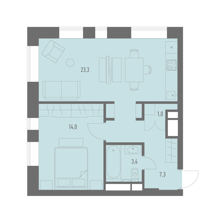 В зависимости от корпуса мы можем получить планировку с лоджией или без таковой, с квадратными или удлиненными комнатами, с большим или маленьким холлом или даже с отдельной гардеробной. В некоторых однушках кухня такого размера, что ее вполне можно считать кухней-гостиной.