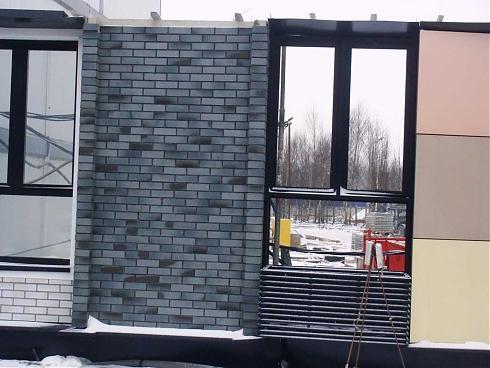 Здания, построенные в рамках первой очереди, очень похожи друг на друга, их отличает разве что цветовая гамма. Внешняя отделка - сертифицированные навесные вентилируемые фасады «Норд Фокс» от компании «Техностайл» с минераловатным утеплением и отделкой клинкерной плиткой немецкого производства. Никаких лоджий или балконов, только корзины для кондиционеров.