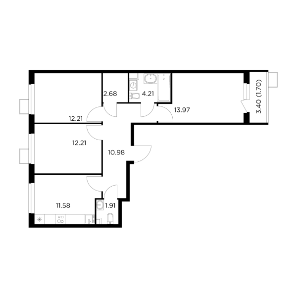 Трехкомнатные квартиры в стиле евро очень похожи на нормальные «двушки». Раздельный санузел, кухня около 18 кв.м., спальни от 10,9 до 15,4 кв.м. Прихожая более 9 кв.м., но в некоторых случаях ее часть отдана под кладовку. В настоящей «трешке», как и положено мы находим три спальни от 12 до 16,9 кв.м., кладовочку размером около 3 кв.м., кухню более 13 кв.м. Лоджии могут сопрягаться как с кухней, так и со спальней. Встречаются варианты с лоджией и балконом обращенными на разные стороны света.