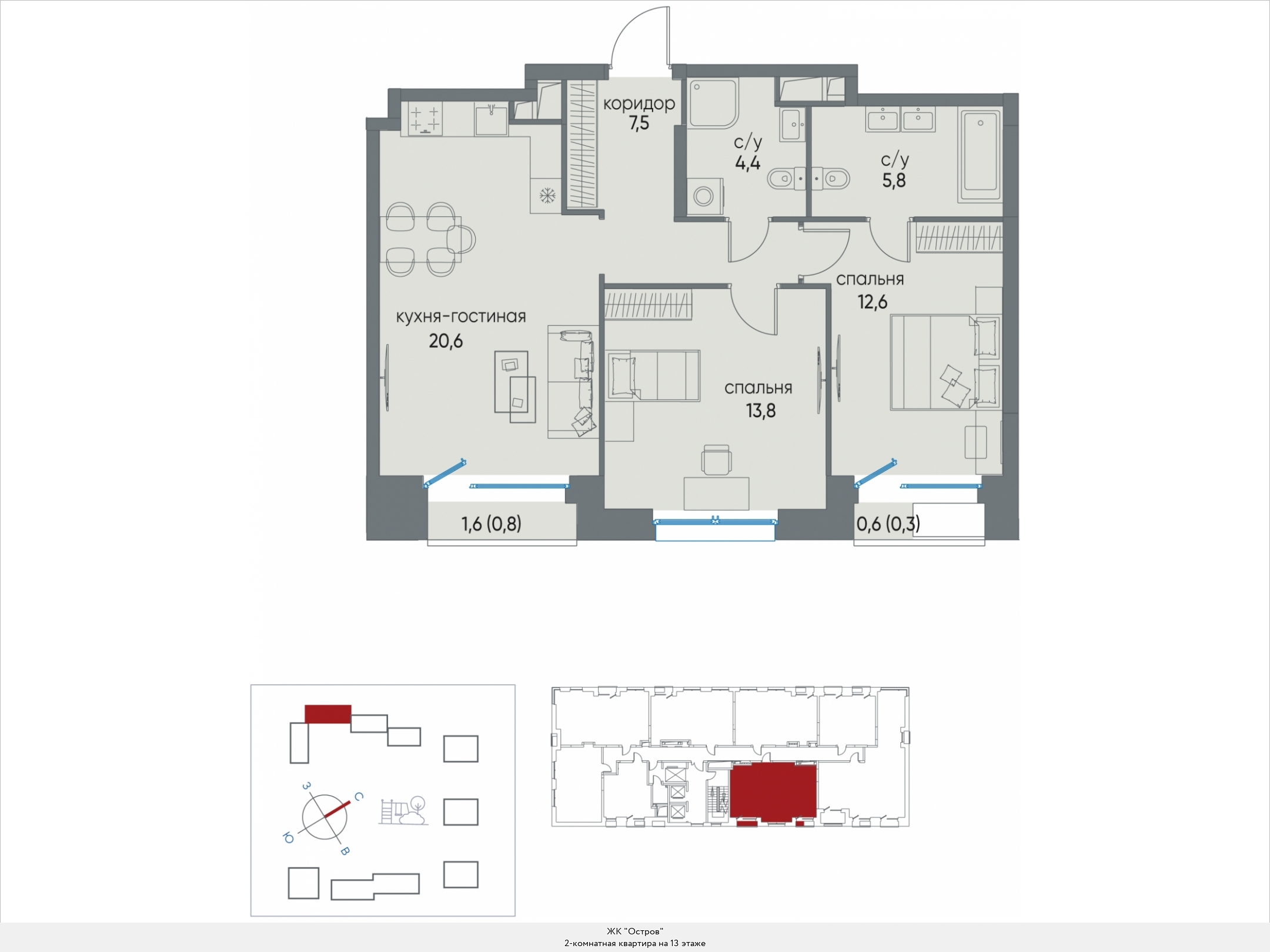 В двухкомнатных квартирах находим входную зону площадью от 4,7 до 7,8 кв.м., два санузла с площадью помещений от 2,0 до 4,9 кв.м., кухню площадью от 17,8 до 44,1 кв.м. и две спальни площадью от 11,1 до 16,5 кв.м. В некоторых вариантах планировки есть дополнительная комната (кабинет) площадью 12,9 кв.м. и хозяйственное помещение площадью 2,2 кв.м., есть мастер-спальни. Встречаются террасы площадью 31,7 кв.м. Расположение окон одностороннее и угловое, есть комнаты с двумя и тремя окнами.