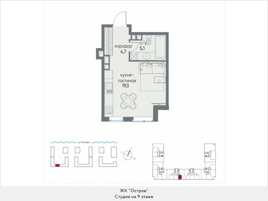 Студия спроектирована предельно просто. Входная зона площадью от 4,7 кв.м., совмещенный санузел площадью от 5,1 кв.м., универсальная комната площадью от 19,3 кв.м.