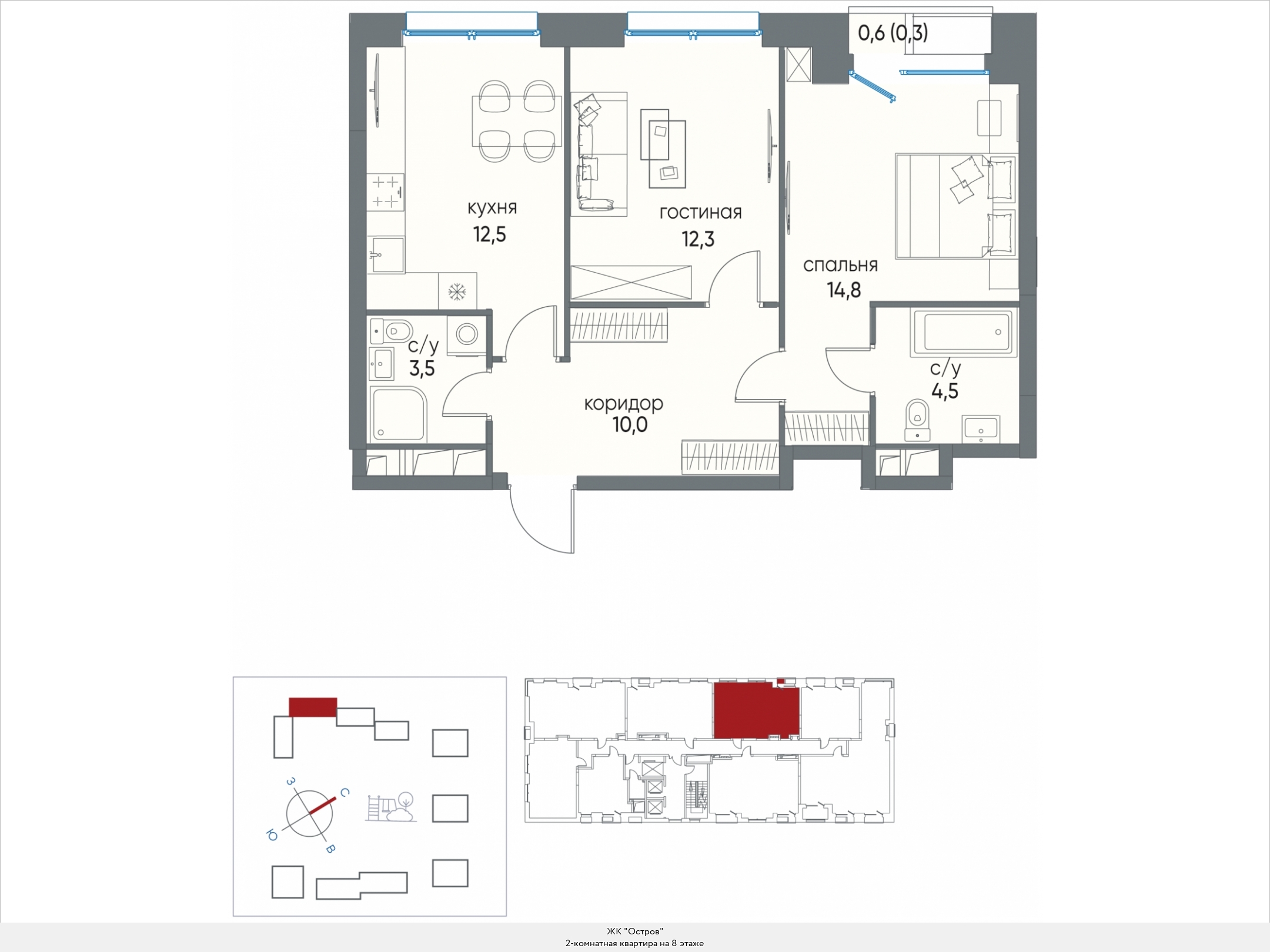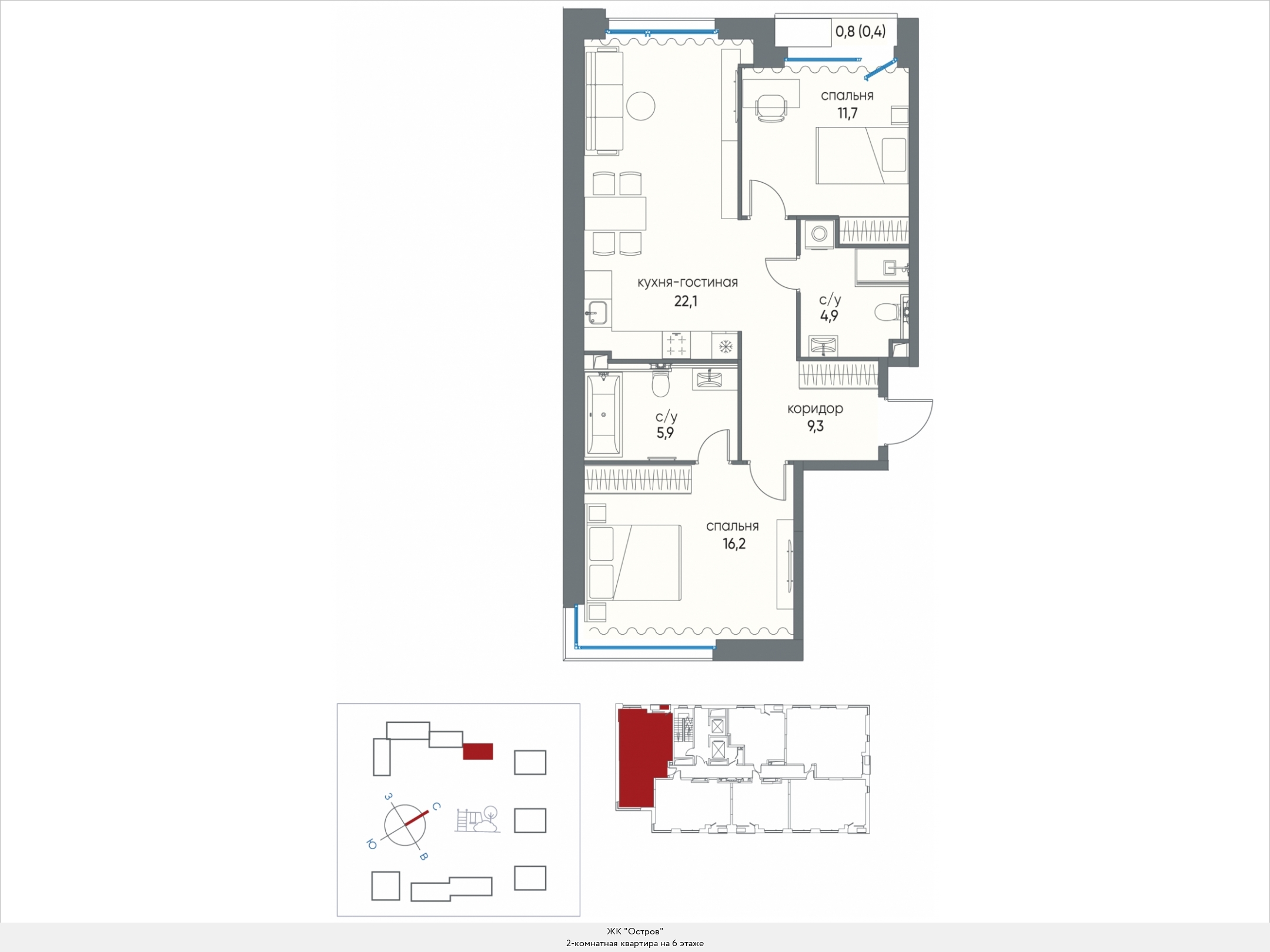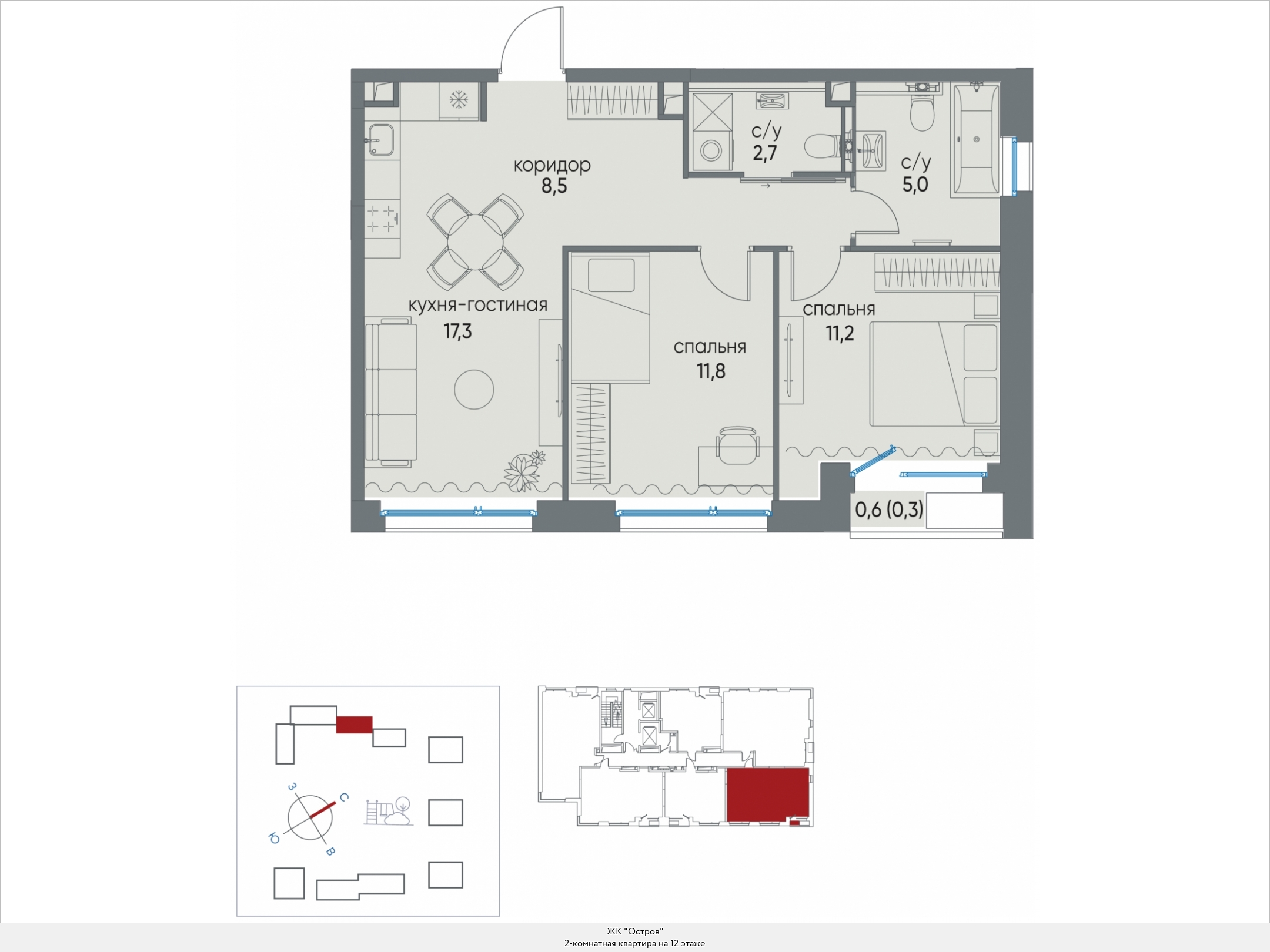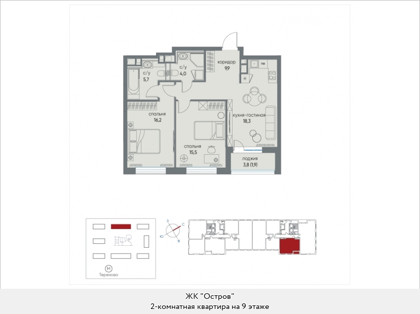 В двухкомнатных квартирах находим входную зону площадью от 4,7 до 7,8 кв.м., два санузла с площадью помещений от 2,0 до 4,9 кв.м., кухню площадью от 17,8 до 44,1 кв.м. и две спальни площадью от 11,1 до 16,5 кв.м. В некоторых вариантах планировки есть дополнительная комната (кабинет) площадью 12,9 кв.м. и хозяйственное помещение площадью 2,2 кв.м., есть мастер-спальни. Встречаются террасы площадью 31,7 кв.м. Расположение окон одностороннее и угловое, есть комнаты с двумя и тремя окнами.